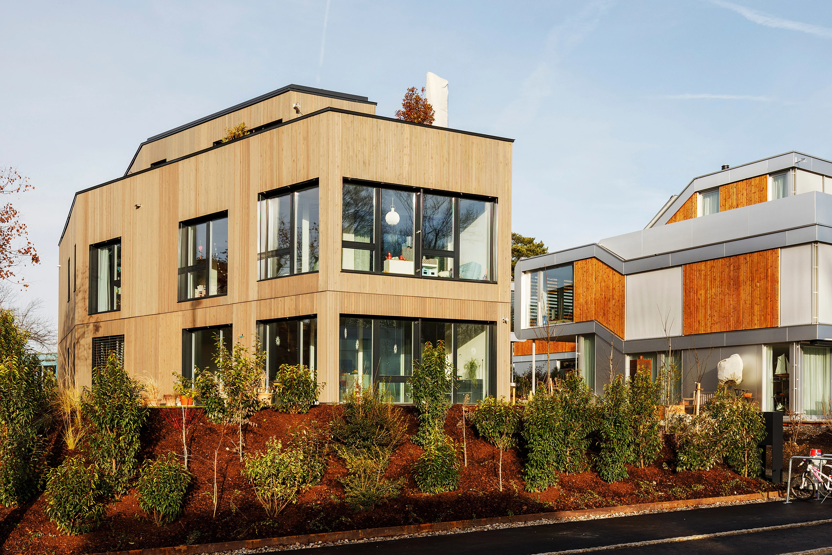 Das Gebäude wird in intelligenter Hybridbauweise mit einer Tragstruktur aus Stahl/Beton und einer nachhaltigen Aussenhülle aus Holz erstellt. Jede Einheit verfügt über ein eigenes kostensparendes Heizsystem mit Erdsonde und Wärmepumpe.